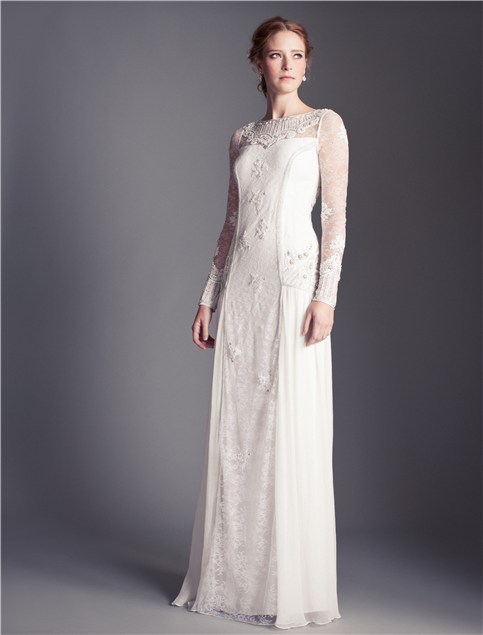 Sheer chiffon and tulle are used together with lace appliques creating exquisite illusion details across the neck, back and sleeves.