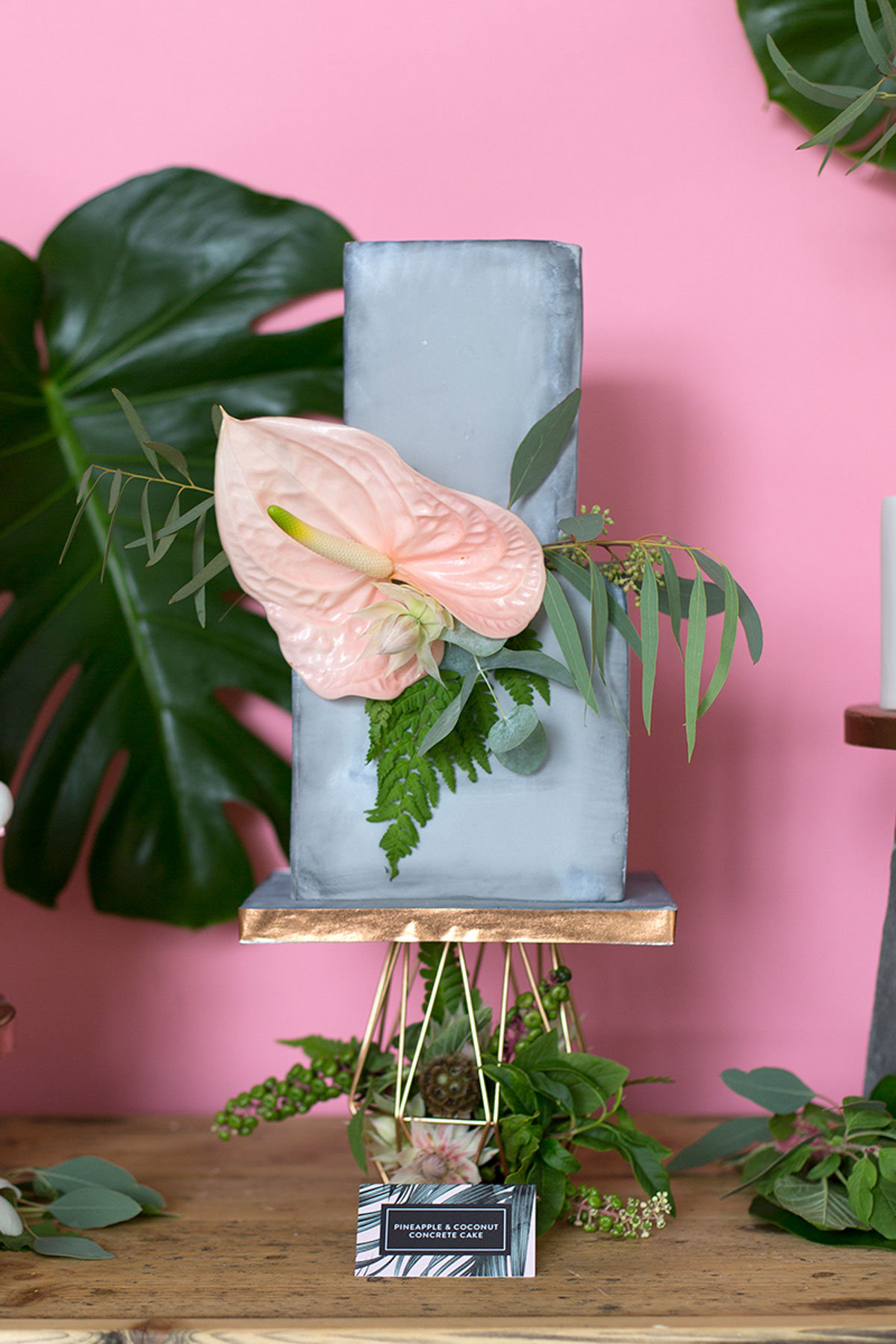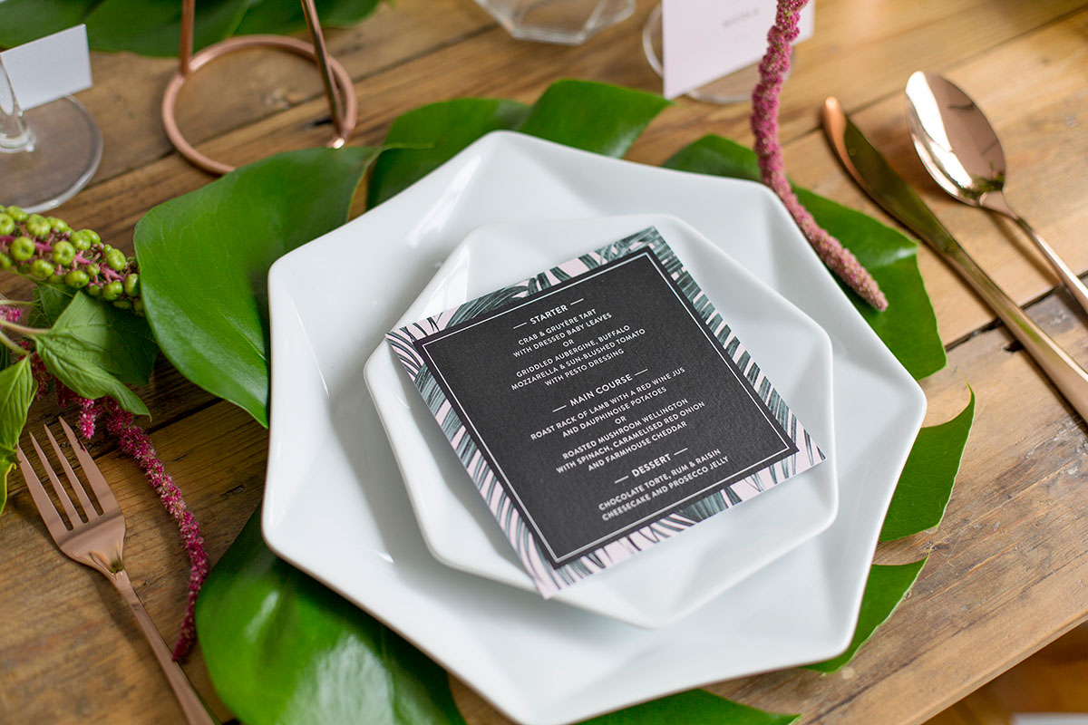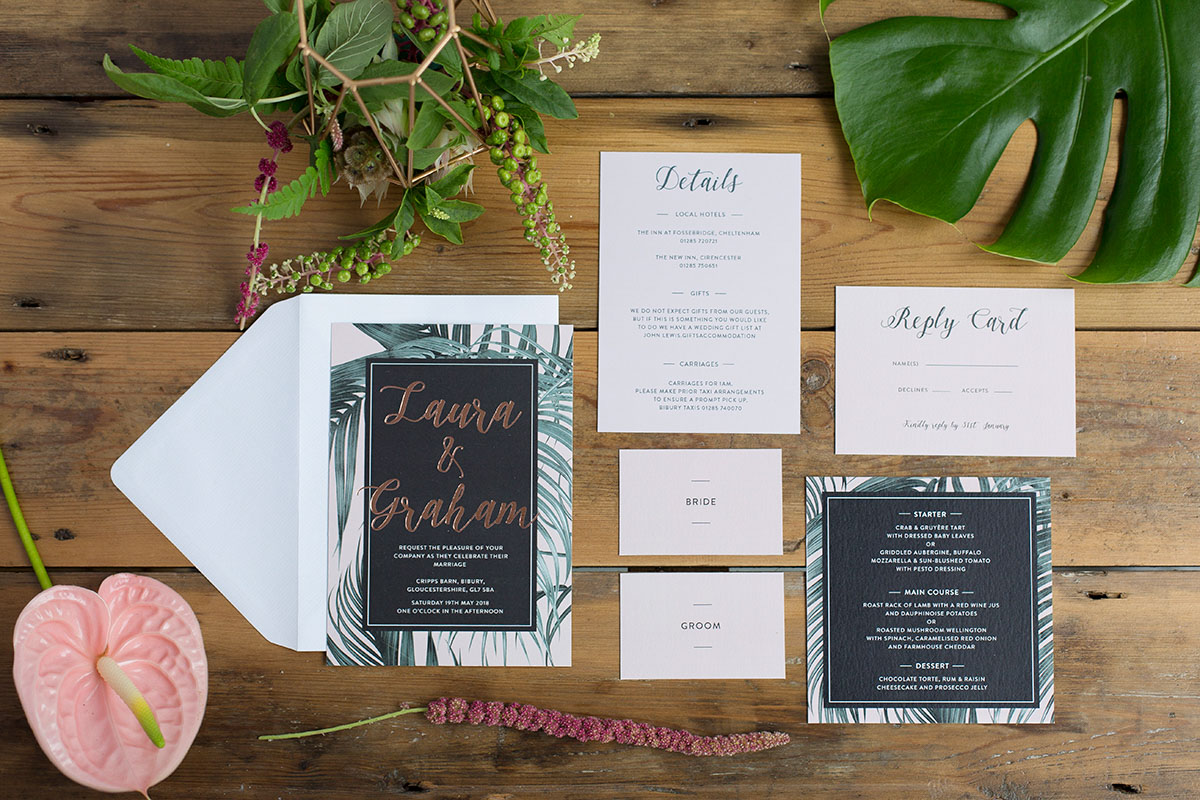 Katie from Malarkey Cakes was the brains behind the shoot, and created a bunch of truly awesome and original cakes. We were so cuffed when she asked us to be apart of the team. We created some tropical style wedding stationery, with the invitation having rose gold foil detailing.