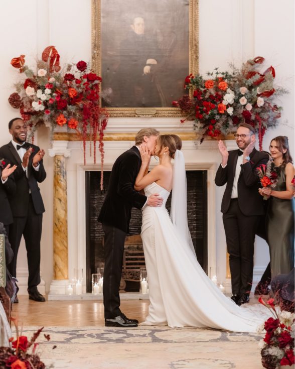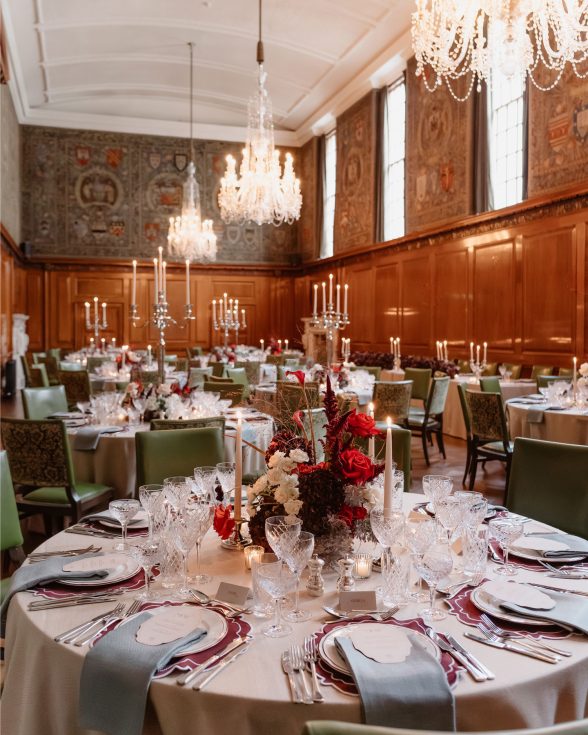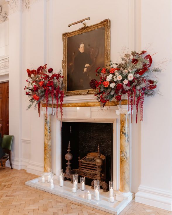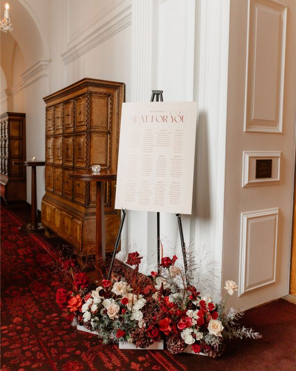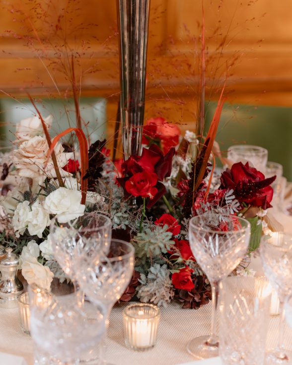 The Blume Studio built the entire scheme around deep, jewel-toned reds and a dusty grey-blue that stopped the whole thing from ever feeling too heavy or expected. Thistles were woven throughout the florals, which gave everything this wonderful wild, slightly gothic texture. The fireplace arrangements in particular — those cascading deep red blooms against white marble — were jaw-dropping. It’s the kind of styling that makes you stop scrolling.