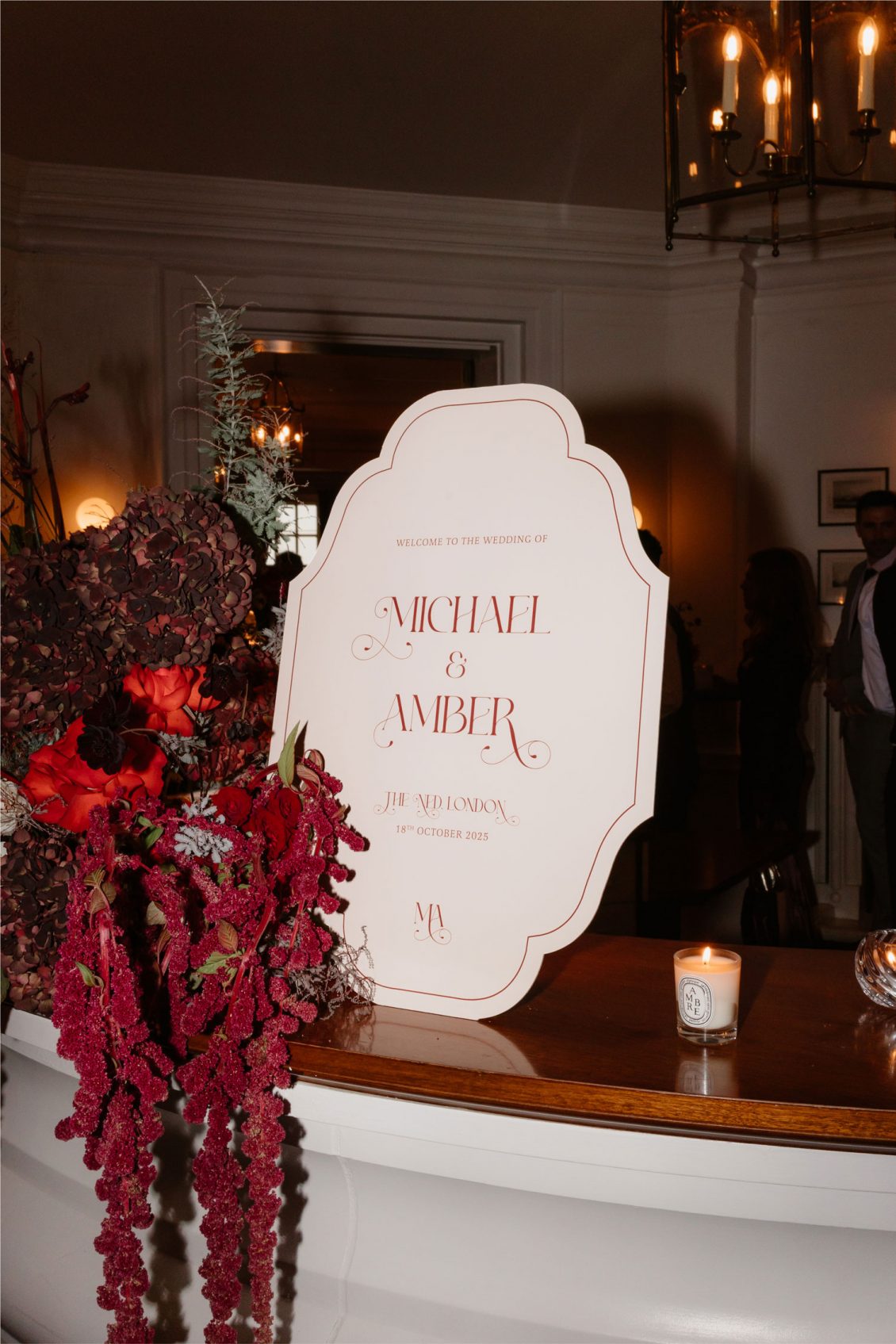 For their stationery, Michael and Amber chose our Baroque Noir collection, but worked with us to shift the colourway to suit their day. This is genuinely one of our favourite parts of the process — taking a signature design and making it feel completely specific to one couple. In its original form Baroque Noir leans dark and dramatic, but by bringing in those deep reds and soft ivory tones, the whole suite ended up feeling like it had been designed alongside the florals from the very start. Which, in a way, it was — we always recommend couples loop in their florist and stationer at the same time for exactly this reason.
