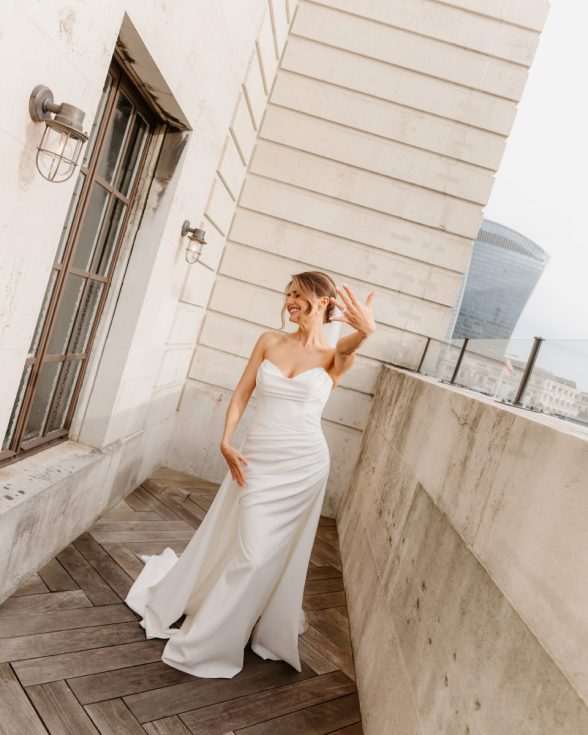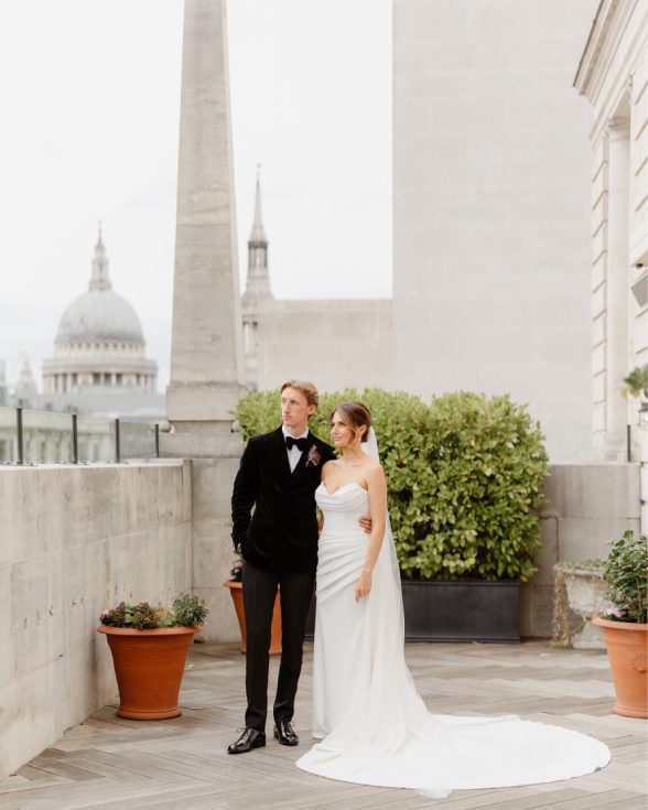 The rooftop portraits with St Paul’s in the background are worth lingering on too — Amber in that sleek, structured gown with a cathedral-length train, Michael in a classic black tux. The whole day had this tension between grand and intimate that’s genuinely rare to pull off, and these two did it effortlessly.