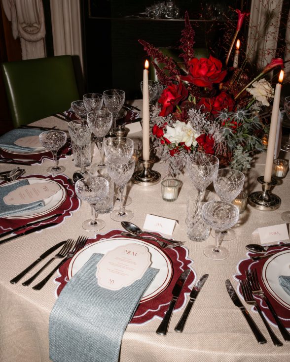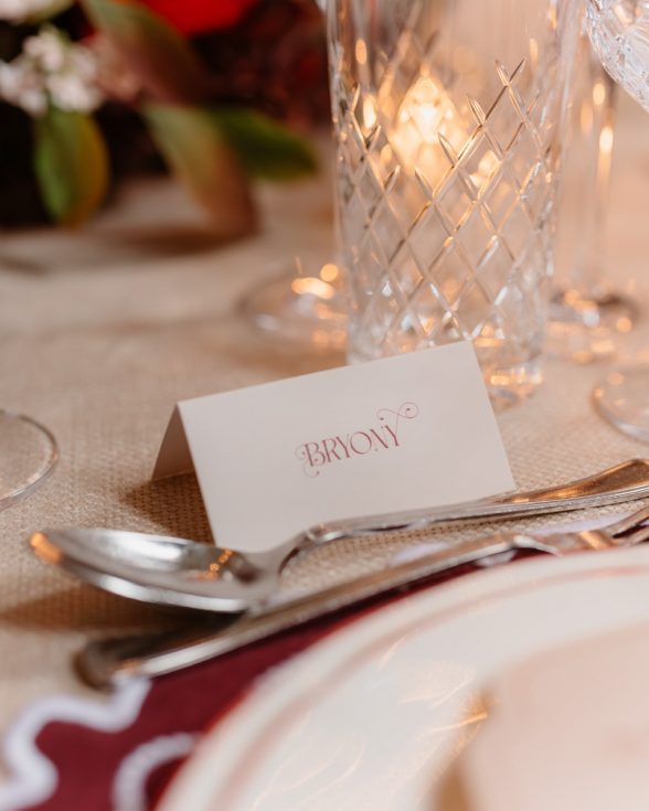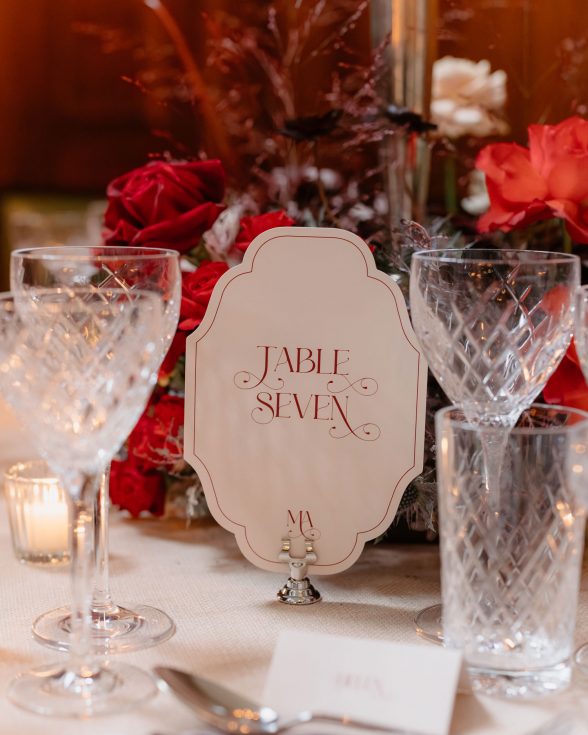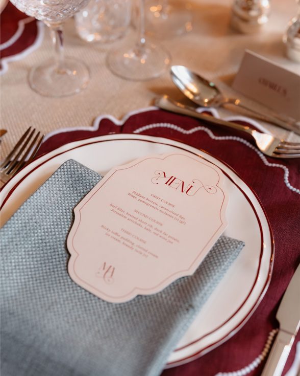 The full suite ran from the welcome sign at the entrance through to the seating plan, table numbers, menus and personalised place cards. Every piece used the same ornate typography and framing that the collection is known for. Photographed against the jewel-toned charger plates from Maison Margaux, the dusty blue-grey linen napkins, and all that glittering crystal, the stationery really came into its own. It’s one of those suites where the individual pieces are beautiful, but together on the table they’re something else entirely.